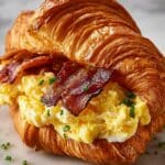This Bacon Egg Cheese Croissant recipe is the ultimate breakfast sandwich, combining crispy thick-cut bacon, fluffy scrambled eggs, melted cheddar cheese, and buttery croissants. Perfectly toasted and warmed, this sandwich delivers a satisfying and flavorful start to your day with optional touches like hot sauce and fresh chives for added zest.