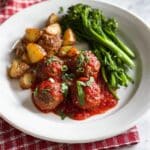 Store leftover meatballs and vegetables in an airtight container in the refrigerator for up to 3 days. Reheat gently in the oven or microwave until heated through. Potatoes may lose some crispness when reheated, so re-crisp in a hot oven if desired.
