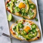 A quick and delicious breakfast recipe featuring warm naan breads topped with creamy low-fat cream cheese, tangy mango chutney, fried eggs, fresh avocado slices, zesty lime juice, spicy green chili, and fragrant coriander leaves. Perfect for a flavorful and satisfying morning meal.