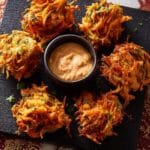 Deliciously crispy carrot pakoras are a flavorful Indian-inspired snack made from grated carrots, shallots, and aromatic spices, coated in a light cornflour batter and deep-fried to golden perfection. Served with a refreshing yogurt, lime pickle, and mint dip, these pakoras make a perfect appetizer or teatime treat.