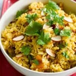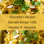 A flavorful and aromatic Chicken Biryani made with basmati rice, tender chicken breasts, and a blend of spices simmered together with curry paste, raisins, and chicken stock. This one-pot stovetop biryani is garnished with fresh coriander and toasted almonds for a delightful and comforting meal.