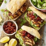 6. Assemble the burgers: On each ciabatta bun, layer shredded Little Gem lettuce, sliced cucumber, mint leaves, sliced red onion, and the grilled chicken breast. Spoon generous amounts of the chutney on top.