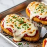 This classic Chicken Parmesan recipe features tender, thinly pounded chicken breasts breaded with seasoned panko and Parmesan cheese, quickly pan-fried to a crispy golden brown, then topped with marinara sauce and melted mozzarella cheese before finishing in the oven. A comforting Italian-American favorite, it is garnished with fresh parsley and perfect served alongside spaghetti and garlic bread.