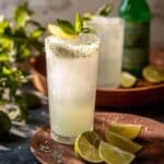 A tall clear glass filled with a frothy white drink and ice cubes, with a salted and green herb rim on top. The glass is garnished with a green mint sprig and a yellow-green lime wedge placed on the rim. In front of the glass, on a dark textured surface, are more lime wedges scattered around. In the background, a second similar drink and a green bottle rest on a round wooden tray, with some fresh green mint leaves on the left side. The scene is lit by warm light and set against a white marbled texture. Photo taken with an iphone --ar 4:5 --v 7