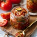 This Courgette & Tomato Chutney is a richly flavored, sweet and tangy preserve that perfectly balances the freshness of courgettes, tomatoes, and apples with warming spices. Slow-simmered to a thick, dark consistency, it’s ideal for adding a zesty kick to sandwiches, cheeses, and roasted dishes. The chutney requires no special equipment beyond a large pan and sterilized jars, making it a straightforward and rewarding homemade condiment.