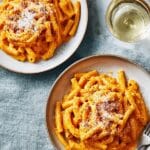 The image shows two round white plates filled with short tube pasta covered in thick, smooth orange sauce. Each plate has a generous pile of pasta with sauce that looks creamy and rich, topped with a light sprinkle of finely grated white cheese and a few specks of black pepper. One plate has a fork resting on it, partially buried in the pasta. The plates sit on a soft, light blue cloth, and the whole setting is on a white marbled surface. A clear glass of white wine is placed near the upper right corner. photo taken with an iphone --ar 4:5 --v 7