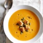Store leftover pumpkin soup in an airtight container in the refrigerator for up to 3 days. The soup can also be frozen for up to 2 months. Reheat gently on the stove or in the microwave, stirring occasionally to maintain a smooth texture. Keep croutons and pumpkin seeds separate and only add them when serving to preserve their crunch.