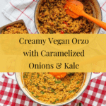 Keywords: vegan orzo, creamy orzo pasta, caramelized onions, kale recipe, vegan main dish, sweet potato sauce, butternut squash, plant-based meal