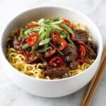 6. Step 6: Serve the crispy chilli beef over cooked noodles if desired. Garnish with the remaining red chilli slices and the green parts of the spring onions. Add prawn crackers on the side for extra texture.