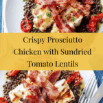 A delicious and easy-to-make crispy prosciutto chicken dish featuring juicy chicken thighs wrapped in savory prosciutto, paired with warm puy lentils and flavorful sundried tomatoes for a satisfying, wholesome meal.