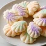 A white plate holds a ring of small, shell-shaped cookies with a soft, pale cream color and a slightly crumbly texture. Each cookie has ridged edges creating a scalloped pattern. Sprinkles of purple, orange, and green sugar crystals are scattered on top, giving a delicate colorful shimmer to the cookies. The cookies overlap slightly, arranged in a loose circle on a surface with a white marbled texture. Photo taken with an iphone --ar 4:5 --v 7
