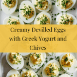 Classic devilled eggs recipe featuring creamy, tangy filling made with mayonnaise, Greek yogurt, Dijon mustard, and a hint of spice, garnished with fresh chives for a delightful appetizer or snack.