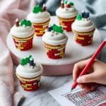 - Assemble the cupcakes: Just before serving, insert the fondant legs into the buttercream icing on the cupcakes, turning them into whimsical elves and Santas. Optionally, use a chimney paper sleeve around the cupcake cases for an added festive touch.