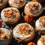 6. Frost and Decorate: Once the cookies are completely cool, generously frost each cookie with the cream cheese frosting. Sprinkle fall-themed sprinkles on top to add a festive touch.