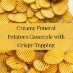 Keywords: funeral potatoes, cheesy casserole, hash browns casserole, comfort food, potato chip topping