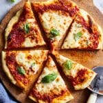 This gluten-free pizza recipe features a crisp, homemade crust made from gluten-free bread flour, topped with a rich, homemade tomato and basil sauce, and finished with fresh buffalo mozzarella. Perfect for those seeking a delicious, wheat-free alternative without compromising on flavor or texture.