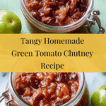 This Green Tomato Chutney is a flavorful, tangy, and sweet preserve made with fresh green tomatoes, cooking apples, and a blend of spices simmered to a thick, jammy consistency. Perfect as a condiment to complement a variety of dishes, it combines the tartness of green tomatoes with the sweetness of dried fruits and brown sugar, balanced with warming spices and a hint of heat from chili flakes.