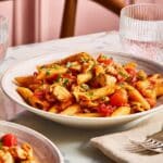 A white shallow bowl filled with rigatoni pasta covered in a red tomato sauce. The pasta is mixed with pieces of chicken, small cherry tomatoes, and sprinkled with fresh green herbs. The bowl is placed on a white marbled surface with a soft pink background. Next to the bowl are two clear glasses with water and part of another white shallow bowl with the same pasta dish is shown. A yellow cloth napkin is partially visible behind the main bowl. Photo taken with an iphone --ar 4:5 --v 7