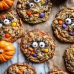 These Halloween Monster Mash Cookies are a fun and festive treat combining chewy oats, crunchy pretzels, colorful Halloween M&M’s, and gooey chocolate chips. Decorated with candy eyes, these cookies bring a spooky twist to your dessert table, perfect for Halloween parties or festive snacking.