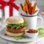 This homemade burger recipe features flavorful lean mince beef or turkey patties infused with spicy chili and garlic pastes, ketchup, and brown sauce, served in toasted hamburger rolls with your favorite toppings. Crispy and seasoned sweet potato wedges roast alongside the burgers for a delicious and satisfying meal cooked entirely in the oven.