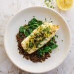 Store any leftover fish and lentils separately in airtight containers in the refrigerator for up to 2 days. Reheat gently in the oven or microwave until warmed through. Note that the fish is best eaten fresh for optimal texture and flavor.