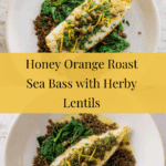 This honey and orange roast sea bass is a bright, flavorful dish perfect for a quick midweek dinner or a special occasion. Tender sea bass fillets are roasted in individual foil parcels with a sweet and tangy glaze, served atop fresh, herby lentils for a wholesome meal.