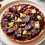 - Invert and garnish: Once baked, run a knife around the edge of the pastry to loosen it from the pan. Carefully invert the tart onto a serving plate so the roasted beetroot is on top. Scatter the toasted pecans and crumbled Wensleydale cheese over the tart before serving.