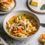 Store leftover soup in an airtight container in the refrigerator for up to 3 days. To reheat, warm gently on the stovetop over medium heat or in the microwave until heated through. If the noodles absorb too much broth during storage, you can add a little more chicken broth or water when reheating.