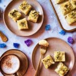 The image shows small square pieces of a yellowish dessert topped with green crushed nuts, arranged in multiple groups. Some pieces are on two round, light brown plates with a smooth texture, one of which has a golden fork holding a piece. Another group of squares sits on white parchment paper over a tray. In the corners, two rustic cups filled with frothy cappuccinos topped with a sprinkle of brown powder can be seen. The whole scene rests on a blue surface with scattered pink and purple paper decorations. Photo taken with an iphone --ar 4:5 --v 7
