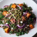 This vibrant and nutritious Kale Quinoa Lemon Salad combines roasted sweet potatoes, hearty kale, fluffy quinoa, and a zesty lemon dressing. It’s garnished with toasted pumpkin seeds, feta cheese, and optional pomegranate seeds for a burst of color and flavor, making it a perfect wholesome meal or side dish.