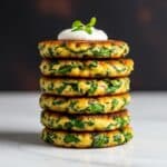 Crispy and flavorful kohlrabi fritters made with chickpea flour and aromatic spices, served with a refreshing herb-infused Greek yogurt sauce. These fritters combine grated kohlrabi and its tender leaves for a delicious vegetable-packed snack or appetizer that’s lightly fried to golden perfection.