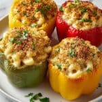 This Mac and Cheese Stuffed Peppers recipe combines creamy, cheesy macaroni with vibrant bell peppers for a comforting and visually appealing meal. The bell peppers are filled with rich macaroni and cheese, topped with a crispy breadcrumb and Parmesan crust, then baked until golden and tender—perfect for a hearty lunch or dinner.