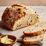 A rustic round loaf of bread is placed on a light cutting board over a white marbled surface. The bread's crust is golden brown with a slightly rough, textured look showing some dark spots from baked ingredients, likely olives. The bread is sliced with two thick slices gently leaning against the main round loaf, revealing its soft, light beige inside dotted with small dark bits matching the crust's spots. Beside the cutting board, there is a small wooden bowl filled with creamy butter. The soft light enhances the warm tones of the crust and the smooth texture of the butter. Photo taken with an iphone --ar 4:5 --v 7