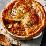 This one-pot paneer curry pie combines rich, spiced Indian curry flavors with a buttery all-butter puff pastry crust. Paneer cubes are pan-fried and simmered in a flavorful sauce of caramelized onions, garlic, ginger, tomatoes, and aromatic spices, with potatoes, spinach, and peas adding hearty texture. Topped with golden baked puff pastry, this comforting dish is perfect served with pilau rice or green vegetables.