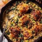 This One Skillet Tuscan Chicken and Orzo is a cozy, flavorful all-in-one meal that’s perfect for busy weeknights. Juicy chicken and spicy sausage combine with creamy orzo and kale in a savory sauce that will satisfy your comfort food cravings.