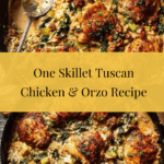 This One Skillet Tuscan Chicken and Orzo is a rich and comforting dish that combines tender chicken, spicy Italian sausage, and creamy orzo with vibrant kale and Parmesan cheese. Cooked entirely in a single oven-safe skillet, it offers an easy yet elegant meal perfect for weeknight dinners or special occasions.