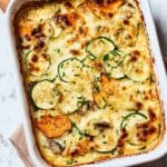 This oven-roasted sweet potato and courgette tortilla is a hearty and flavorful Spanish-inspired dish featuring thinly sliced sweet potatoes, courgette, and onion baked to tender perfection and bound together with a creamy egg and crème fraîche mixture, topped with manchego cheese and fresh chives. Perfect served warm or cold alongside a green salad for a satisfying meal.