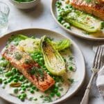 This pan-fried salmon with braised Little Gem is a light and flavorful dish that combines tender lettuce and fresh peas with perfectly cooked salmon. It’s a quick and elegant meal perfect for busy weeknights or casual dinners.