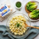 Store the egg salad in an airtight container in the refrigerator for up to 3 days. Stir well before serving again. It’s best enjoyed chilled, but you can bring it to room temperature for 10-15 minutes if preferred.
