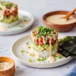 • Chilling the sushi rice before assembling helps maintain the stack’s structure.