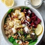 A vibrant and nutritious roasted cauliflower and broccoli bowl served with quinoa, fresh beetroot, baby spinach, toasted walnuts, and a creamy tahini hummus dressing. This wholesome meal is perfect for a healthy lunch or dinner, combining roasted vegetables and plant-based proteins for a deliciously satisfying bowl.