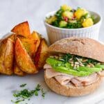 The image shows a sandwich and side dishes on a white marbled surface. The sandwich has three main layers inside a light brown whole wheat bun: bright green avocado slices at the bottom, light pink sliced turkey breast in the middle, and green chopped herbs with sunflower seeds on top. To the left of the sandwich are thick, crispy golden-brown potato wedges. To the right is a small white bowl filled with a green salad that has chunks of bright yellow fruit and some red bits mixed in. Some green herbs are scattered on the surface near the sandwich. Photo taken with an iphone --ar 4:5 --v 7