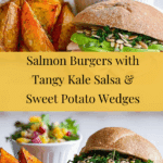 Deliciously wholesome salmon burgers served with tender kale salsa and crispy sweet potato wedges, offering a nutritious and flavorful meal perfect for lunch or dinner.