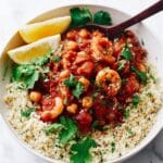 Keywords: seafood tagine, harissa, Moroccan recipe, seafood stew, couscous, spicy seafood, chickpeas, North African cuisine