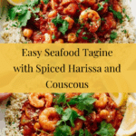 A vibrant and aromatic seafood tagine featuring a spicy harissa tomato base, tender frozen seafood mix, and chickpeas, served alongside fluffy lemon-infused couscous with toasted almonds and fresh coriander for a delightful Moroccan-inspired meal.
