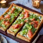 This smoked salmon, leek, & dill tart is a delightful savory pastry perfect for brunch or a light dinner. Featuring a crisp puff pastry base topped with tender sautéed leeks, creamy crème fraîche and eggs, zesty lemon, fresh dill, and smoky salmon trimmings, it combines fresh flavors in a beautifully golden tart that’s both elegant and easy to prepare.