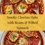 This smoky hake with beans and greens is a vibrant, flavorful dish that’s perfect for a wholesome weeknight dinner. Combining tender hake fillets with chorizo-spiced beans and wilted spinach, it’s both hearty and healthy. A quick garlic mayonnaise on the side adds a creamy zing.