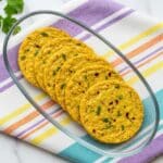 A clear, oval-shaped glass dish holds five golden-yellow, thin, crispy crackers stacked slightly overlapping each other. Each cracker has a textured surface with small green herb pieces and tiny flecks of red and dark brown, giving a speckled look. The dish is placed on a white marbled textured surface covered partially by a cloth with colorful striped patterns in purple, yellow, and orange. Some scattered green herbs are visible near the dish edges, adding a fresh touch. Photo taken with an iphone --ar 4:5 --v 7
