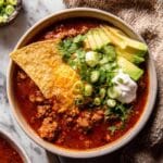 - Serve and garnish: Ladle the chili into bowls and top with salted tortilla chips. Add a dollop of yogurt, avocado slices, chopped green onions, more cilantro, and a squeeze of lime juice to finish. Enjoy warm!
