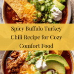 This Spicy Buffalo Turkey Chili is a flavorful and comforting twist on classic chili. Made with ground turkey, smoky spices, and a kick of hot sauce, it’s perfect for warming up on chilly days. Topped with creamy yogurt and crunchy tortilla chips, it’s a crowd-pleaser that’s easy to make at home.
